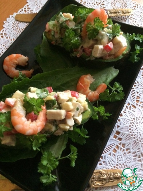 Для соуса смешать йогурт со сливками, солью, перцем, сахаром и заправить салат. Получившейся массой наполнить половинки авокадо и украсить петрушкой и креветками.