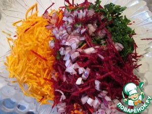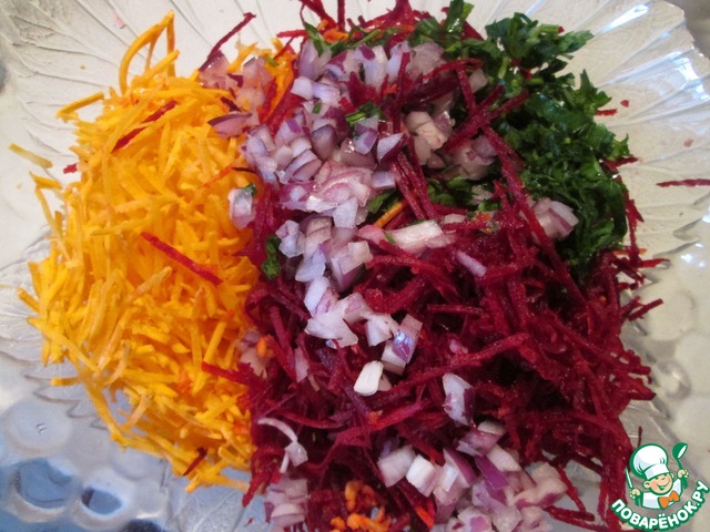 Очистите свеклу и морковь, натрите на терке для корейской моркови. Лук и петрушку порежьте мелко.