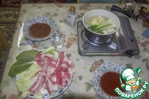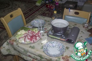 Вообще-то рецептом это, пожалуй, не назовешь. Скорее "способ поедания мяса". Но очень вкусно. И, к тому же, мероприятие. Не сидишь, уныло черпая, ложкой суп, а участвуешь в целом обряде, и рот с желудком не обижены. Как писала в каком-то романе Агата Кристи: "... счастливый гость - занятый гость".