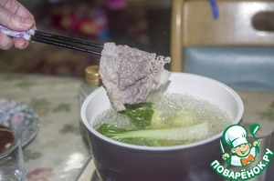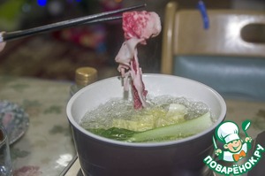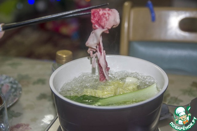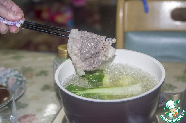 Дальше - каждый действует самостоятельно (но клювом не щелкает). Берем кусочек сырого мяса, окунаем его в кипяток и слегка там полощем (сябу-сябу).