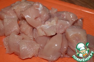 Куриное филе моем, обсушиваем и тоже рубим небольшими кусочками. Сбрызгиваем лимонным соком и даем полежать.