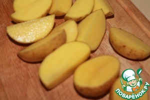 Наконец, режем картошку прямо в кожуре на дольки, предварительно хорошо ее вымыв (желательно со щеточкой).