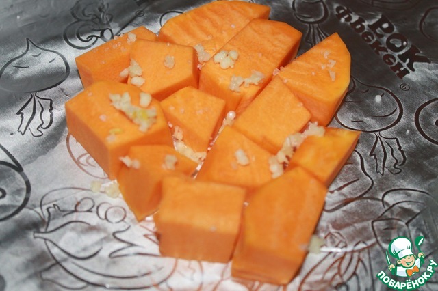 Отрезаем кусок фольги, расстилаем на столе. В середину выкладываем тыкву, солим.