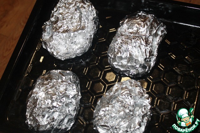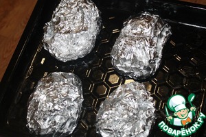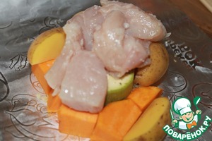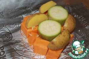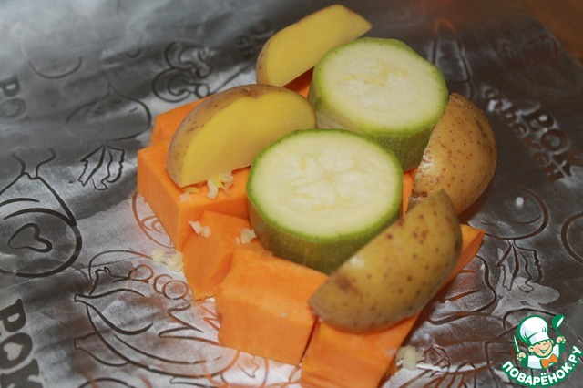 Разогреваем духовку до 200 градусов. Повторяем операцию с оставшимися овощами и курицей. Получается четыре сверточка, которые мы выкладываем на противень. Запекаем 25-30 минут. Наша цель - чтобы курица не пересушилась, а тыква осталась целенькой, но мягкой.
