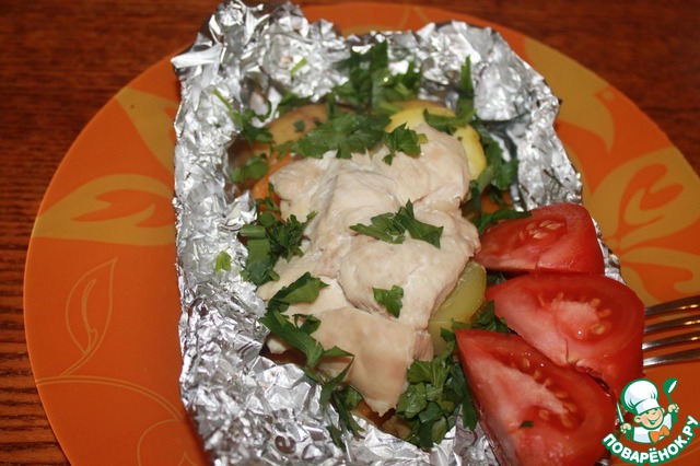 Достаем из духовки, аккуратно разворачиваем верх сверточков, посыпаем кушанье рубленой петрушкой. Можно добавить свежих овощей по вкусу. Приятного аппетита, друзья!)