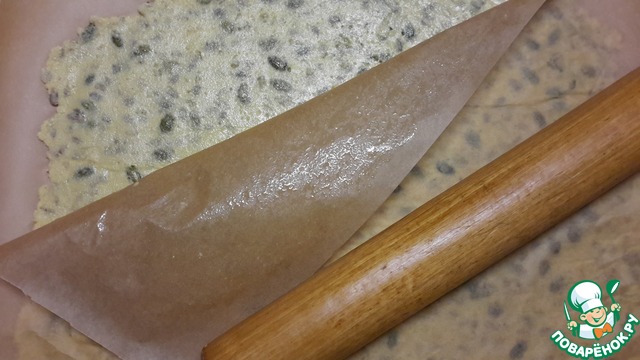 Выкладываем противень пекарской бумагой, а сверху тесто. Накрываем другим листом пекарской бумаги и раскатываем тонким слоем по размеру противня. Если духовка, а соответтвенно и противень небольшие, то печь можно в два приёма.