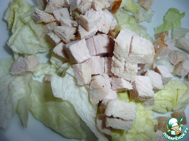 Филе индейки (у меня была печеная, можно взять любое отварное мясо) порезать небольшими кубиками и выложить на салат.