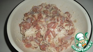 Приготовим то, что я называю - фарш. Гуляш зачистим от лишнего (жилы, шкурки) и мелко порежем. Если у кого есть решетка для домашней колбасы - перекрутим мясорубкой. Сало, лук и чеснок "пропустим" через мелкую решетку мясорубки. Вымешиваем...