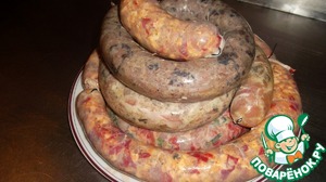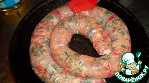 Получаем 4 колечка колбасы, выкладываем их на тарелку и отправляем на сутки в холодильник (или хотя бы на 12 часов). Необходимо, что бы мясо "познакомилось и подружилось" с наполнителями и специями...