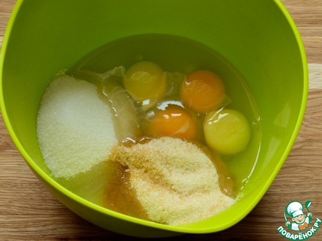 В чаше соединяем яйца и сахар. (Первый раз я использовала и белый, и коричневый сахар, увеличив общее количество сахара до 300 г.)