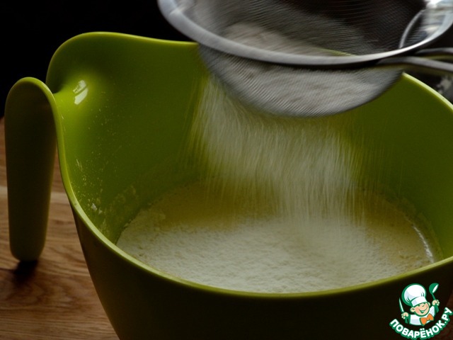 Муку смешиваем с разрыхлителем и в несколько заходов просеиваем на взбитую яично-сахарную смесь. Вмешиваем уже вручную. То есть, часть муки просеяли, перемешали лопаткой, еще часть просеяли, перемешали и так далее...
