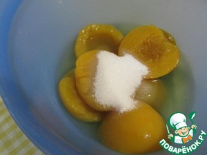 Этим временем приготовить мусс из консервированных персиков. В чаше соединить персики, 150 мл персикового сиропа, сахар и лимонную кислоту.