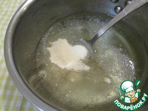 В сотейник влить воду, 150 мл персикового сиропа. Поставить на огонь и подогреть. В горячей массе распустить желатин. Размешать до растворения желатина. Дать остыть примерно до 30°С.