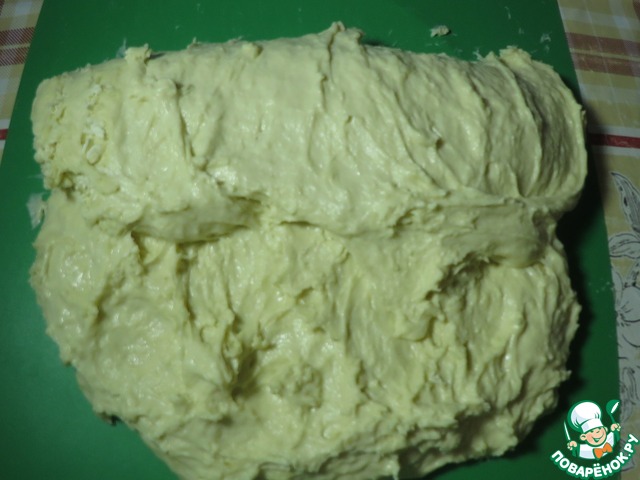 Тесто получается довольно липким, поэтому рабочую поверхность и руки можно слегка смазать маслом. Тесту придать форму условного прямоугольника.