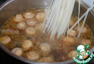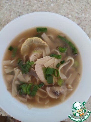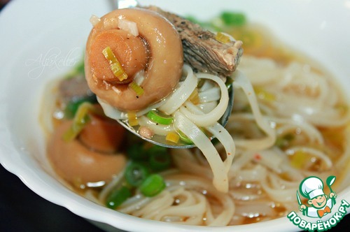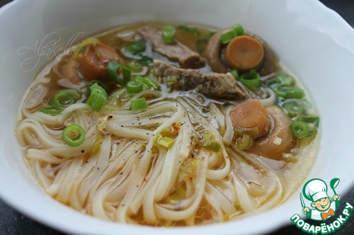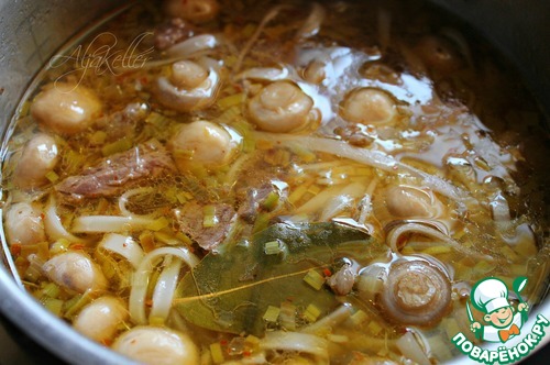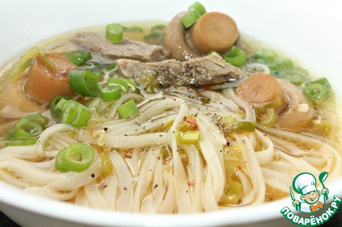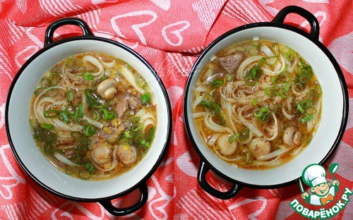 Говядину нарезать соломкой толщиной около 1 см, отправить в кастрюлю с бульоном. Добавить зажарку с грибами, лавровый лист, смесь красных перцев и широкую рисовую лапшу. Досолить по вкусу. -
