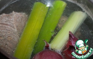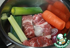 Говядину суповую нарезать на 3 равные части. Уложить в кастрюлю мясо, сельдерей черешковый, зелёную часть лука-порей, морковь небольшого размера, чеснок 2 зубка и красный лук (он придаёт оттенок бульону, но можно использовать обычный репчатый). Залить 1,5 л холодной воды, отправить на плиту.