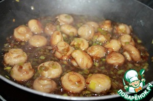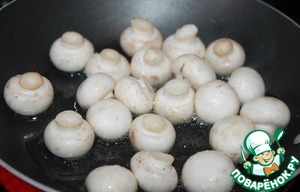 Для этого маленькие шампиньоны помыть и отправить на сковороду с небольшим количеством растительно масла. Обжарить около минуты, помешивая. -