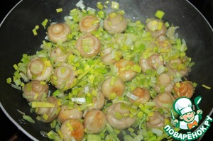 Мелко порубить остальную часть лука-порей (около 5 см длиной), чеснок измельчить удобным для вас способом. Отправить к шампиньонам и обжарить около минуты, помешивая.