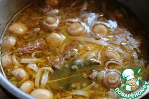 Снять пену, после закипания убавить огонь до минимума и томить под крышкой около часа.