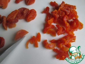 В это время готовим курагу. Обдаём кипятком и затем нарезаем соломкой.