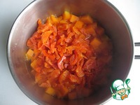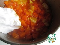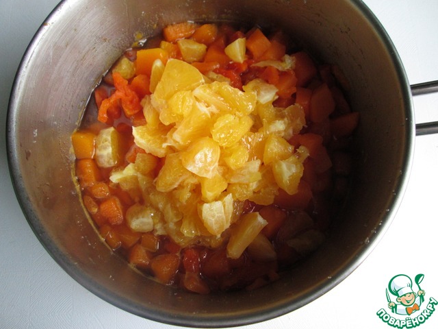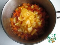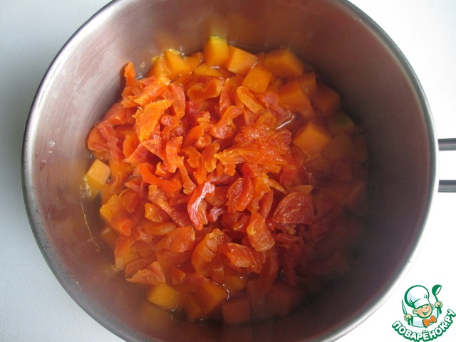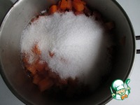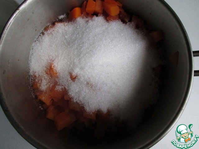 Тыква с курагой немного проварились, и надо аккуратно слить лишнюю жидкость. Теперь добавляем весь оставшийся сахар и перемешиваем.
