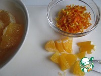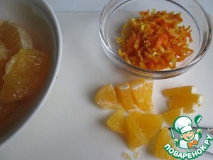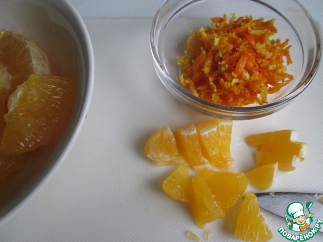 С апельсина снимаем цедру, очищаем от белой мякоти, разделяем на дольки и мелко нарезаем.
