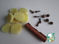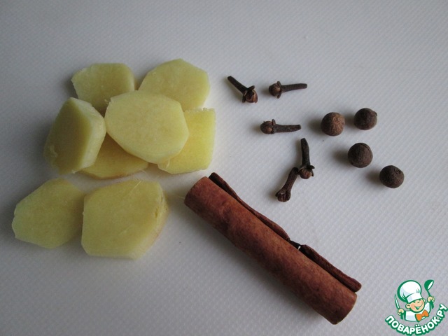 Остальные пряности удобно поместить в мешочек, так как в конце варки их необходимо удалить. Берем 2 слоя марли, или белую х/б ткань в один слой, в центр помещаем гвоздику, душистый перец, палочку корицы и нарезанный имбирь. Края соединяем и завязываем.