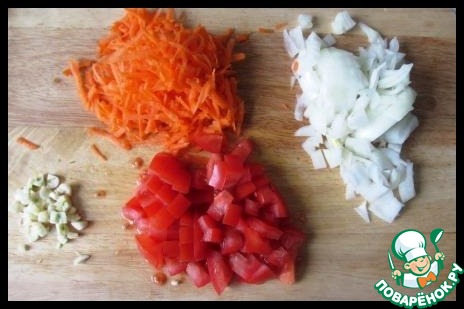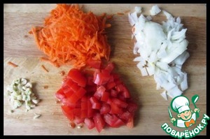 Луковицу мелко нарезать, морковь натереть на терке, чеснок измельчить, помидоры нарезать кубиками.