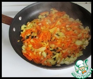 Налить на сковороду растительное масло, выложить лук и морковь и обжаривать на среднем огне минут 7