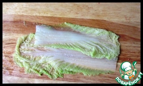 Утолщенную часть листа слегка отбить гладкой стороной молотка для отбивания мяса, или немного срезать, если лист уж очень толстый. -