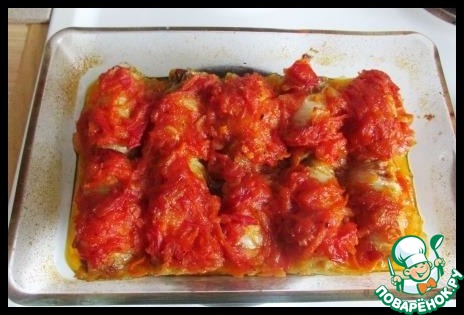 Рулетики перекладывать в форму для запекания. На каждый рулетик выложить по столовой ложке зажарки.