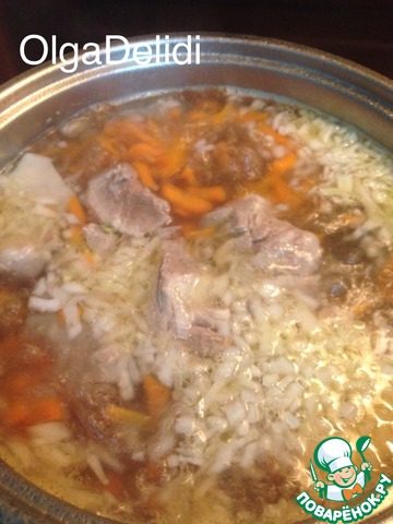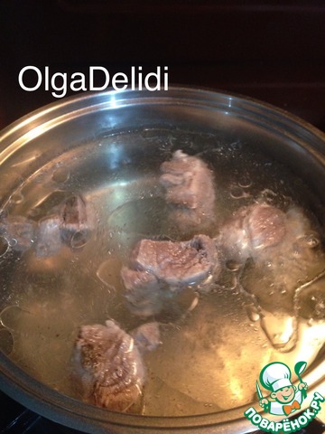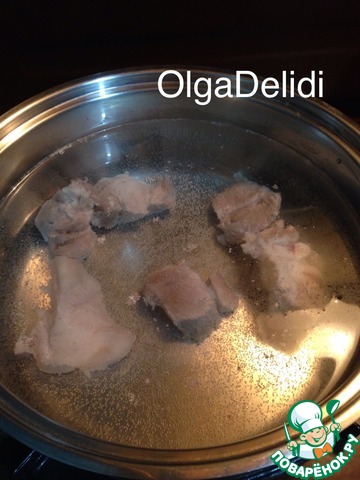 Разрезаем на куски и ставим варить мясо на бульон. Свинину варим около часа. Солим и перчим по вкусу.