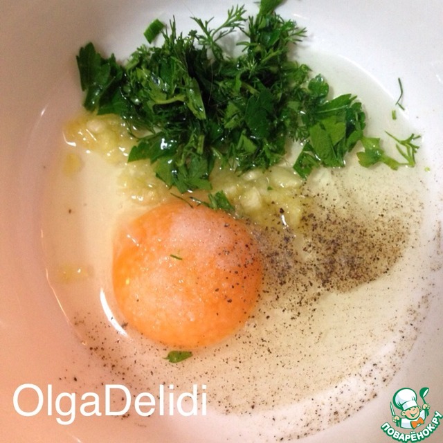 Пока все это варится, готовим клёцки. В миску разбиваем 1 яйцо, соль, перец по вкусу, чеснок и зелень мелко нарезанную.