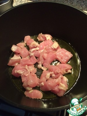 В кастрюле разогреть масло и обжарить филе на сильном огне в течении 2-3 минут.