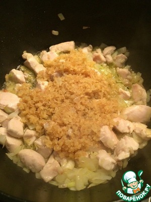 К филе добавить лук, крупу, интенсивно мешая быстро обжарить.