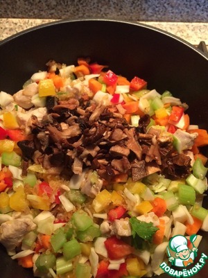 Добавить грибы и овощи в кастрюлю, перемешать.