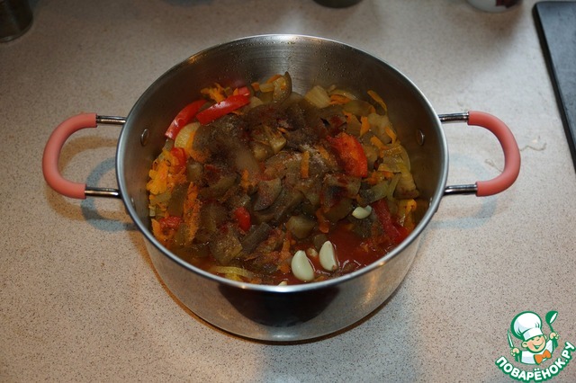 Пересыпать зажарку в кастрюлю с овощами, добавить туда запеченный чеснок и протертые помидоры. Посолить и поперчить.