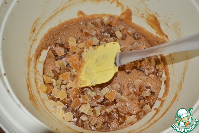 Добавляем цукаты и натертый свежий имбирь. Перемешиваем лопаткой. -