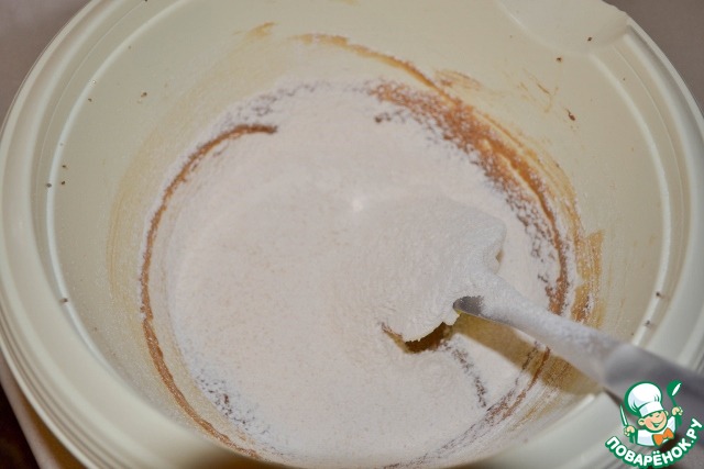 Муку перемешиваем с разрыхлителем и имбирным порошком. Просеиваем в несколько этапов в подготовленную смесь, каждый раз аккуратно перемешиваем лопаткой.