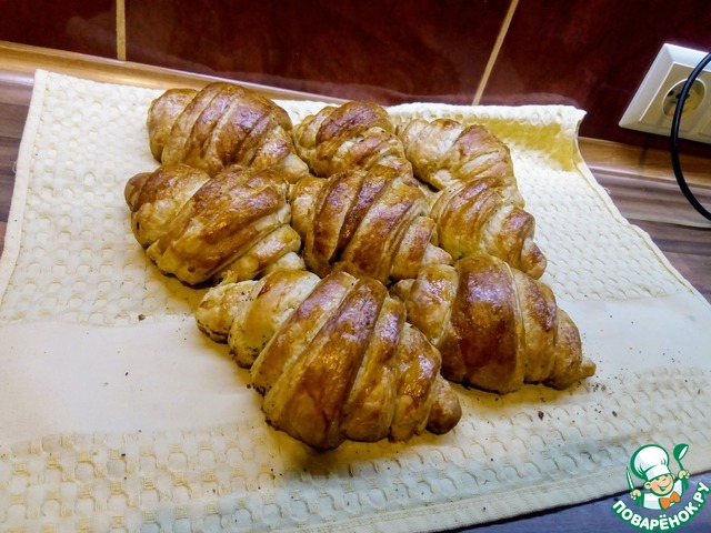 Готовые круассаны выкладываем на смазанный маслом противень швом вниз, накрываем полотенцем и оставляем на расстойку еще на час, затем смазываем круаасаны яйцом и отправляем выпекать в разогретую до 200 градусов духовку на 15-20 минут.