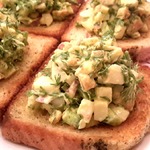 На еще теплые гренки выкладываем по столовой ложки салата и подаем столу.