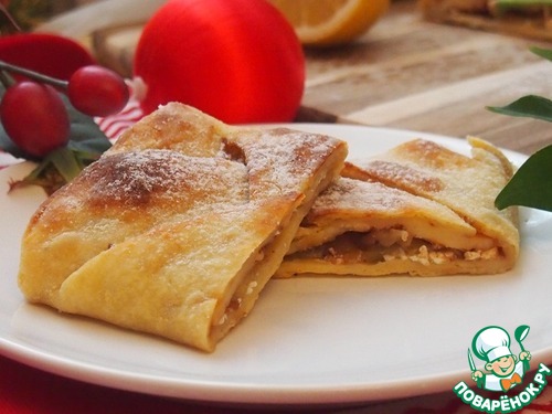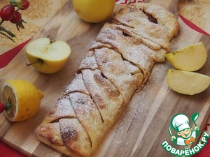 • На сметану выложить яблоки, бруснику, посыпать сахаром и корицей. Сверху и снизу концы закрыть тестом. По бокам надрезанное тесто сложить сверху елочкой. Важное дополнение: тесто раскатывать нужно сразу на бумаге для выпечки, а затем вместе с бумагой сложить на противень. Я этим пренебрегла и поэтому у меня такие неказистые рулеты получились, потому что их очень трудно затем перекладывать на противень со стола.