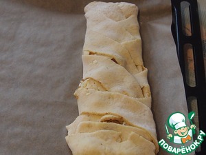 • Тесто разделить на три части. из каждой части раскатать прямоугольник, сделать боковые надрезы длиной примерно 8 см немного наискосок.
