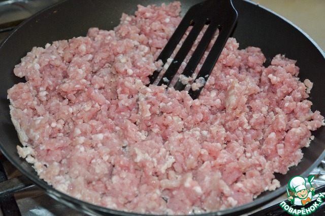 На разогретую сковороду кладем фарш и хорошенько перемешиваем его лопаточкой, чтобы не образовывались большие комки. -