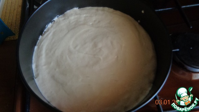 Форму (диаметр 24 см) застелить пергаментом, смазать и выложить тесто. Выпекать при 180 градусах до готовности (до сухой спички).