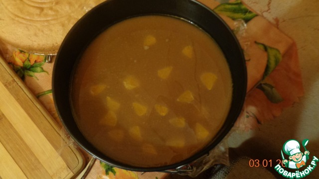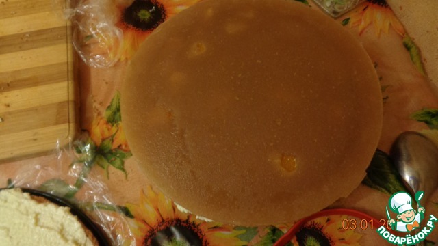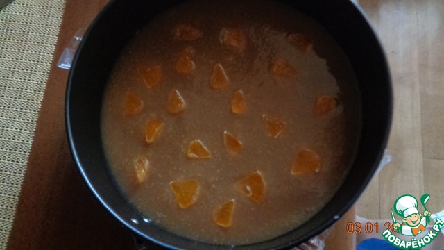 Дно формы (меньшего размера, чем наш будущий тортик, у меня 22 см) застилаем пищевой пленкой и выливаем наш компоте. На дно я выложила дольки мандарина, можно без него, можно заменить чем угодно вкусненьким и красивеньким по вашему желанию. И отправляем компоте в морозилку.