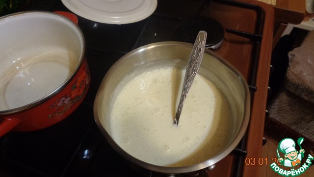 Мусс. Ставим на плиту сливки для прогрева (почти до кипения), тем временем взбиваем миксером желтки+сахар+крахмал и вливаем, не прерывая взбивания, горячие сливки.