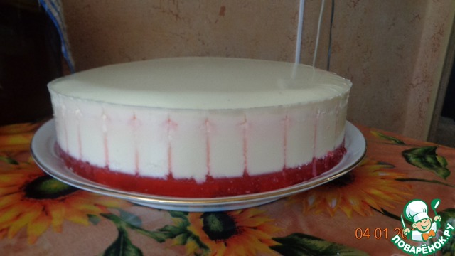 Я немного сделала по-другому. Сначала собрала торт, потом выложила его верхом вниз в форму с частью мусса и затем заполнила бока формы оставшимся муссом. Формой несколько раз постучала об стол.