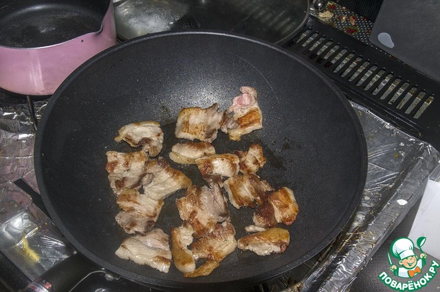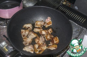 Теперь обжариваем грудинку до красивой корочки с обеих сторон