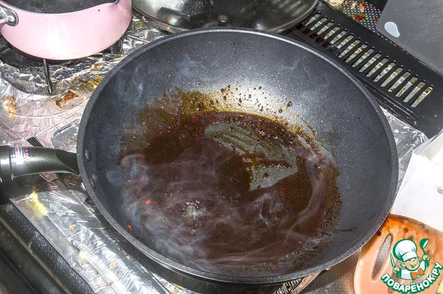 Убираем мясо со сковородки и вываливаем на нее наши соуса. Добавляем немного кипяточку для гомогенности